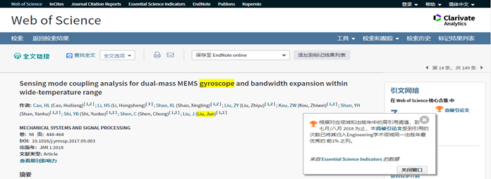 据2018年11月27日ESI最新数据显示,由我院刘俊教授领衔的抗高过载微机械陀螺仪方向的研究论文《Sensing mode coupling analysis for dual-mass MEMS gyroscope and bandwidth expansion within wide-temperature range》入选工程学领域ESI高被引论文。该论文以青年教师曹慧亮副教授为第一作者(刘俊教授为通信作者)发表于《MECHANICAL SYSTEMS AND SIGNAL PROCESSING》期刊(工程:机械领域一区,TOP期刊,2017年影响因子4.37)上,重点解决了微机械陀螺仪机械灵敏度和带宽之间相互矛盾的问题,为高精度、宽带宽微机械陀螺仪的进一步工程应用提供了支持。