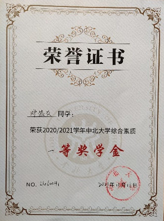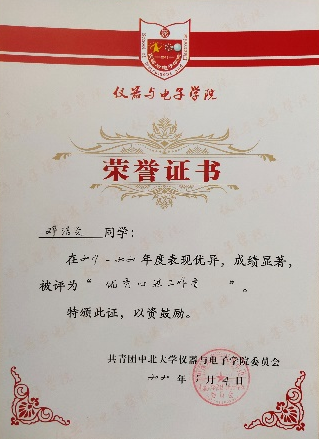 本科生招生宣传活动,为我校与高中母校建起沟通的桥梁。同时,积极参加学科竞赛,获得山西省“互联网+”金奖、智能互联大赛省级二等奖等。最终,于2022年5月获我校本硕(博)贯通计划名额,推免绩点:3.93/5.00,专业排名:19/250。