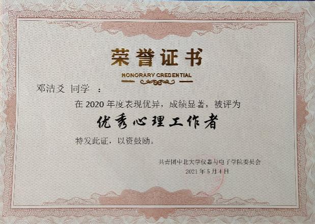 测控技术与仪器专业19060143班学生。入学至今,连续三年担任班级心理委员一职,曾先后加入我院“绘心阁”心理辅导站、生涯工作室、钝刃运动队等学生组织。在校期间,连续三年获威尼斯人