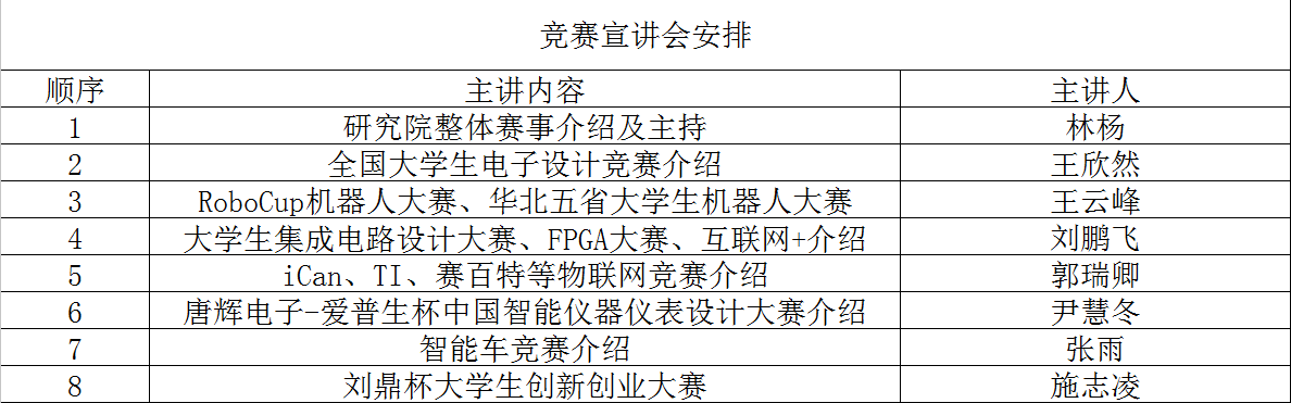 本次宣讲会的主要内容为介绍研究院各个实验室所组织并参加的竞赛。其中包括全国大学生电子设计竞赛,RoboCup机器人大赛,华北五省大学生机器人大赛,iCan物联网大赛,TI物联网大赛,赛佰特物联网竞赛,智能车竞赛,唐辉电子-爱普生杯中国智能仪器仪表设计大赛,互联网+创新创业大赛,刘鼎杯大学生创新创业大赛等多项赛事。