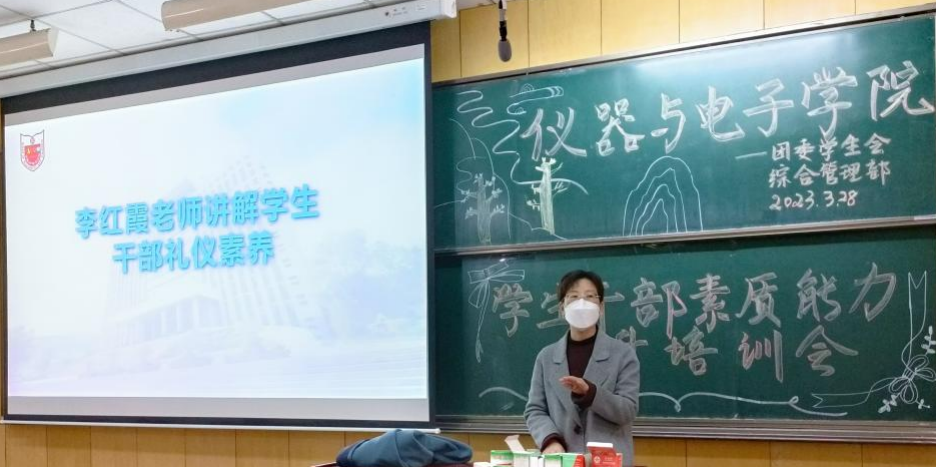 第二讲由辅导员李红霞担任主讲人,李老师结合实例现场对学生干部进行礼仪指导,她提出“在实践中提前历练,才能日后在职场中脱颖而出”,并以创新的工作模式、工作理念为学生干部指明努力方向,为大家提供了详细指导。
