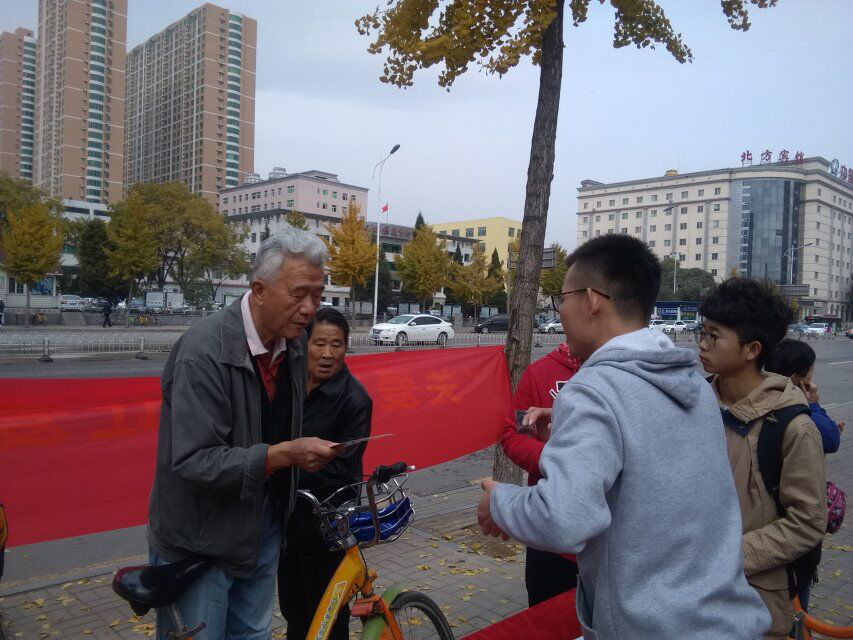 早上六点四十集合,虽是秋季,但中北的早上已经寒风呼啸,我院青志部成员冻得瑟瑟发抖,但同时内心对今天的活动的期待又激发了我们前行的动力。早上七点,我们带着关怀和爱心乘着早班公交车经历了一个小时路程到达了胜利桥东,然后兵分两路南下,一路去往华德广场,另一路目的地学府公园。到达目的地之后,我们先进行了简单的布置以及关于防走失定位贴具体使用的方法跟技巧。继而便开始了轰轰烈烈的宣传跟登记过程。登记过程中,有壮年,有老年,也不乏一些年轻人给自己家人登记领取。我院青志部干事温柔而又耐心的讲解,简直“不厌其烦”都难以恰当形容他们的态度。随着时间的飞逝,活动快要结束了。而在短短两个小时内我们已经送出去70多个定位贴,即意味着可能又帮助到几十位老人的家庭安全温暖,这时青志部干事的脸上又浮现出了幸福的笑容,古人云:赠人玫瑰,手留余香。的确,青志部干事都为自己所作为感到了自豪。