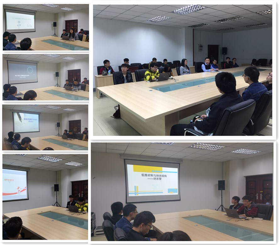 本次活动中,王老师导师班的霍艳丽、章鸿运、章灿然、于博和杨杰五位同学先后作了专题报告。其中,霍艳丽同学对智能温室大棚系统作了详细介绍,章鸿运同学与大家分享了参加电子设计大赛和考研的宝贵经验,章灿然同学详细介绍了低维材料与纳米结构-纳米管,于博同学对动态监测停车场车位系统做了详细描述,杨杰同学介绍了超声波液位仪的相关知识。五位同学的精彩讲解吸引了在场每位师生的注意,赢得了大家的阵阵掌声。王老师对五位同学的报告逐一进行了点评,并给大家分享了如何做报告PPT的经验。
