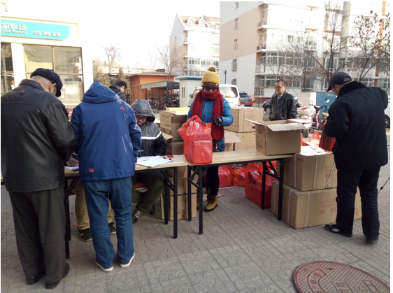 更有一些行走不方便的老人前来,热心的志愿者更是帮助老人把沉甸甸的一袋子医疗物品送回家。为了保证老人们能够在任何时间都能尽快的取到物品,虽然天气寒冷,大家都坚持着在外面工作帮助老人,中午时间也毫不懈怠,中午只在外面吃了盒饭。