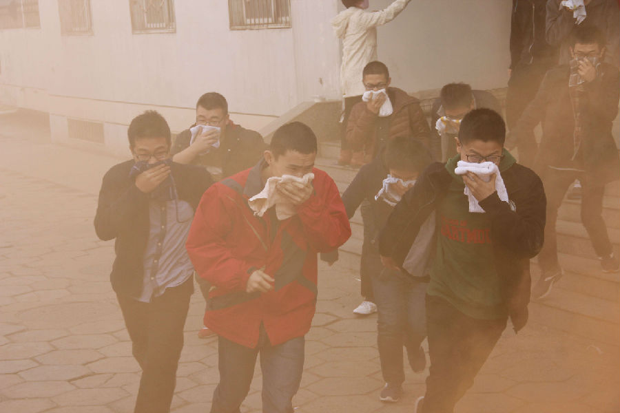下午1点,宿舍楼门口提前燃起了模仿火灾的烟雾,紧接着拉响了火灾警报,所有同学都紧张有序的从宿舍楼开始撤离,弯下身躯,用湿毛巾捂住口鼻,在几分钟内就迅速撤离到了广场。