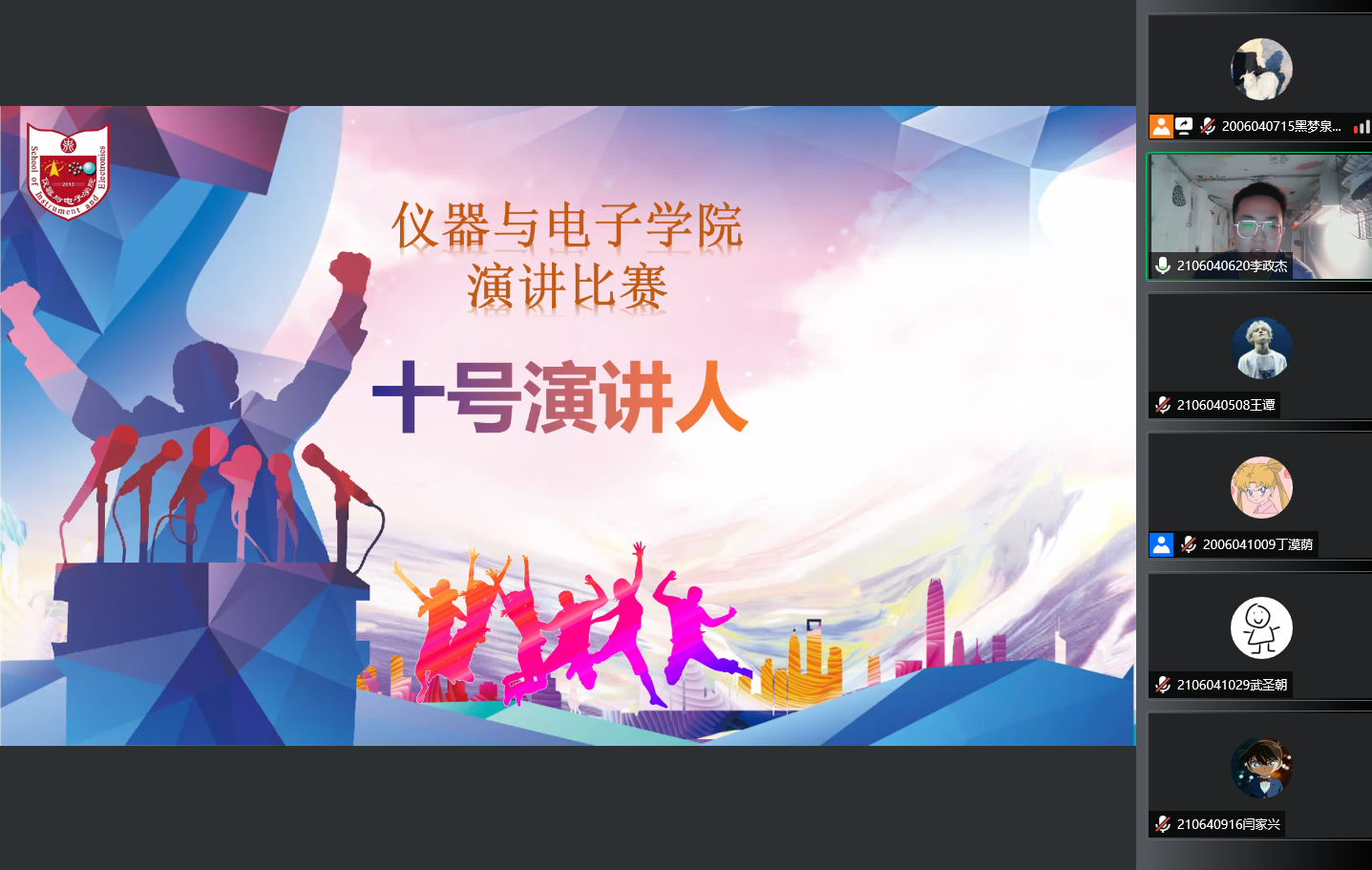 本次比赛分为主题演讲和即兴演讲两部分,由每班派一名代表参加。第一位出场的是来自五班的姚俊杰同学,慷慨激昂的主题演讲和生动的即兴演讲让他拿到了91.6分的高分,为本次比赛呈现了一个精彩的开篇。接下来的同学也不甘示弱,用丰富的词汇、抑扬顿挫的语调和生动的表情为我们展示了青年朝气蓬勃、奋发向上的精神面貌。参赛选手中唯一一位女生是来自十一班的赵佳蕾同学,她给我们带来的主题演讲,让我们随着党的百年红船一路航行到新时代的海洋,抑扬顿挫的语调牵动着每一个听者的心,激情有力的话语们仿佛让我看到了巾帼英雄的身影,最终也不负众望,获得了本次比赛的第一名。