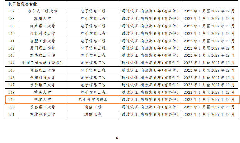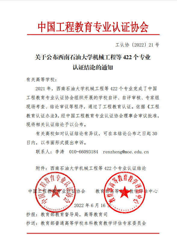 6月16日,中国工程教育专业认证协会和教育部高等教育教学评估中心联合发文《关于公布西南石油大学机械工程等 422 个专业认证结论的通知》(工认协〔2022〕21 号),正式公布了2021年工程教育专业认证结果。本年度共有422个工程教育认证。我院电子科学与技术专业名列其中,顺利通过工程教育专业认证,有效期为6年(2022年1月至2027年12月)。