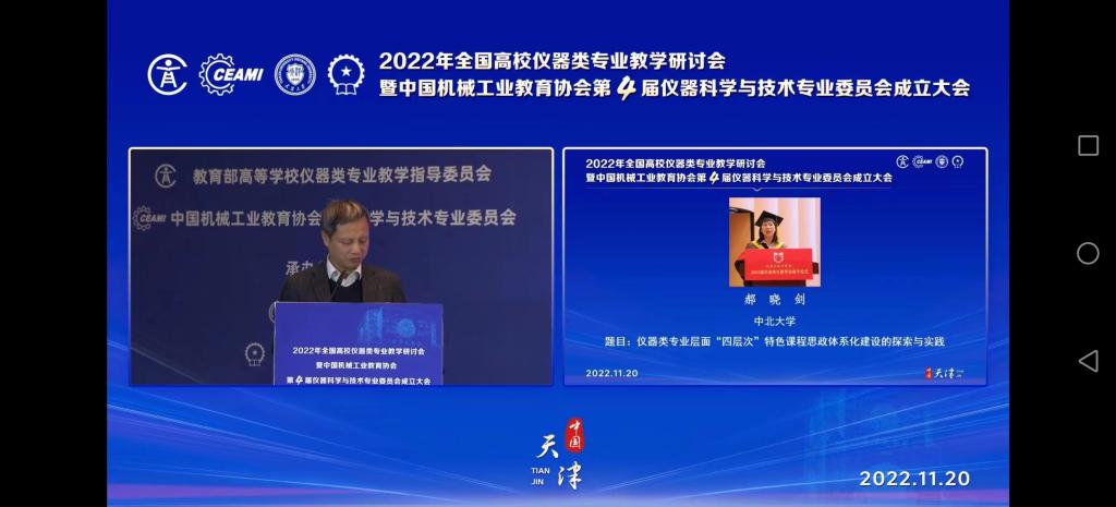 党委书记郝晓剑教授做了题为《仪器类专业层面“四层次”特色课程思政体系化建设的探索与实践》的教学改革成果汇报,并与线上、线下各位教学专家展开了积极探讨和互动,得到了同行们的肯定。