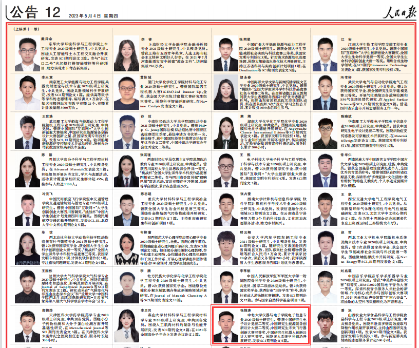5月4日,《人民日报》刊登了2021-2022学年度研究生国家奖学金获奖学生代表名录,我院2020级硕士研究生、国家奖学金获奖学生代表张锦涛荣登名录,全省3名学生上榜。
