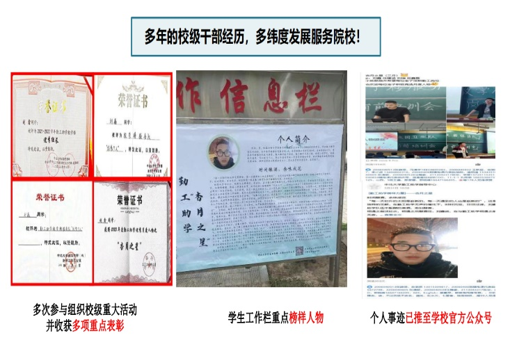 综合素质奖学金,连续两年获校级三好学生荣誉称号,除了学业方面,在其他方面也力争上游,敢为人先,获校级军训优秀个人,校级优秀团员等荣誉称号。并参加校级勤工助学组织在岗任职担任组长职务长达十个月,带组人数超300余人,获得一致好评,并获得勤工助学优秀个人(两次),优秀组长,月度人物(在校内作榜样人物展览)等一系列荣誉称号。现已保送至中国科威尼斯人