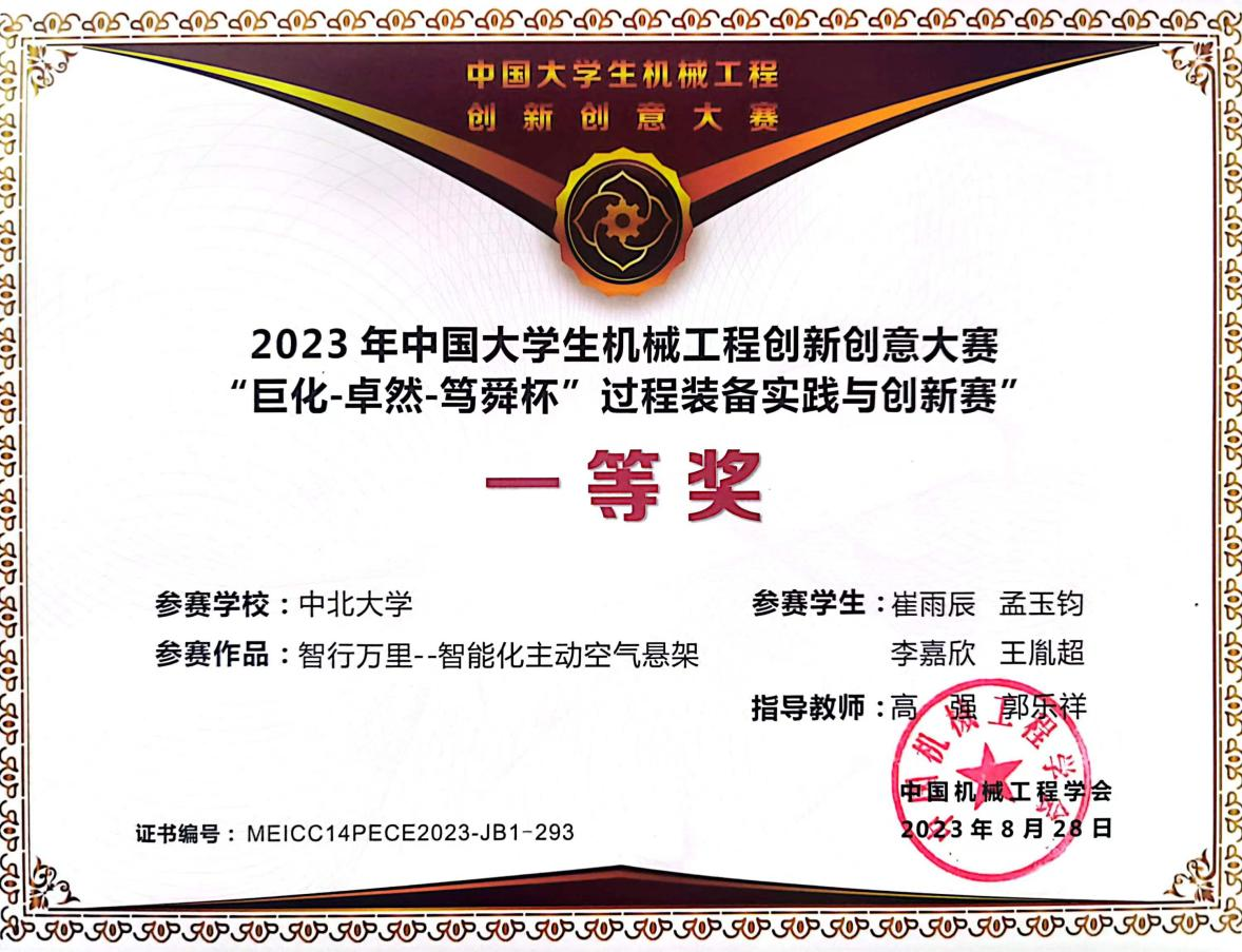 的“mini大创”,我向闫老师等各位老师展示了我关于电动卡丁车的构思与想法,得到了闫老师的大力支持,大一我便开始了探索、设计电动卡丁车与空气悬架的道路。自主设计制作改进一台卡丁车的悬架几乎占据了我整个脑海和思考。结合我所学专业,升级传感器配置,进行更多的数据检测分析,来提升车辆的驾乘体验,最终确认了悬架升级的可行性。之后我决心建立“悬若日月”项目组。从最初的项目构思、设计实践到最后的落地,每一个环节都让我不断挑战自己的能力和取得进步。同时,我带领团队成员进行紧密合作,共同完成项目的各个阶段。当然,在这个过程中,我仅凭自己的爱好是远远不够的。我带领团队利用自己所学的相关技术知识,对汽车悬架系统进行了深入的研究和分析,结合多种传感器和融合算法不断优化设计,最终让“悬若日月”成功落地并以小组第一的身份获得第八届中国国际“互联网+”大学生创新创业大赛国家级金奖。这是学校历史首次、山西省唯一一个主赛道金奖。