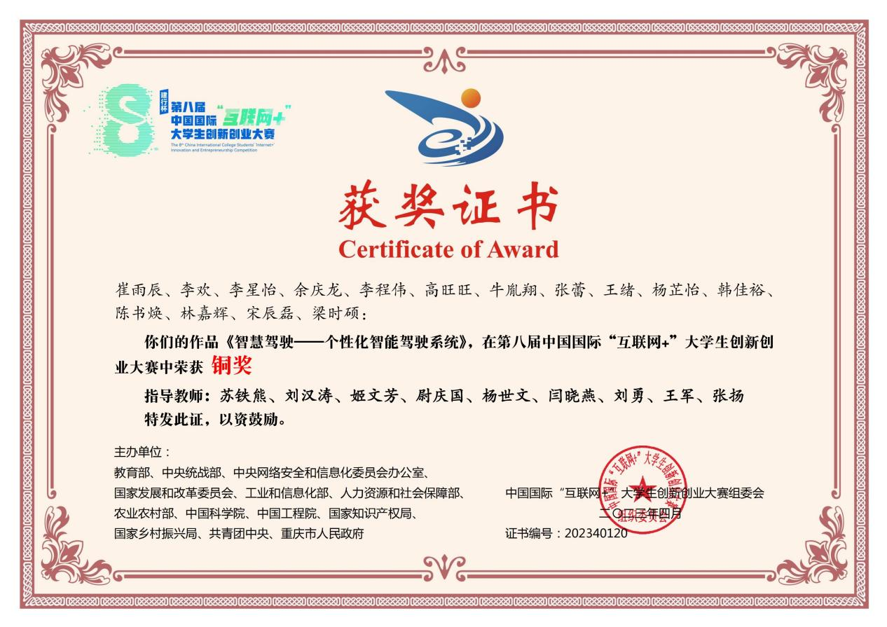 2023年,获第八届中国国际“互联网+”大学生创新创业大赛产业赛道国家级铜奖