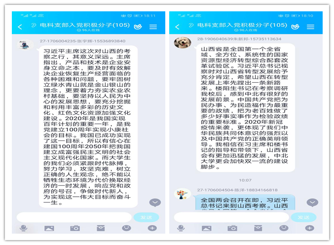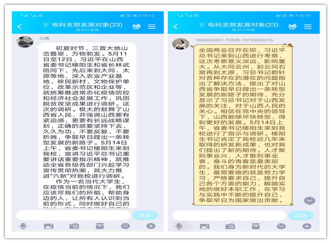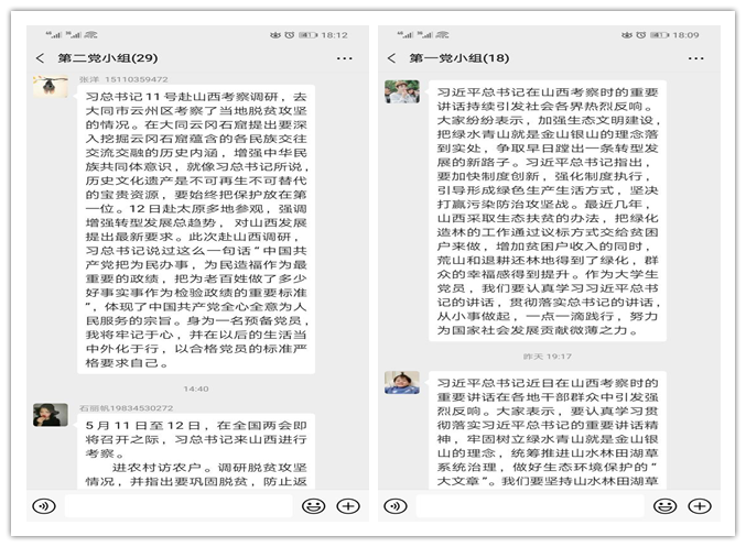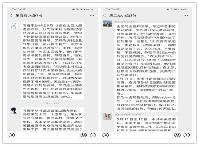 就学习宣传贯彻习近平总书记视察山西重要讲话重要指示进行调研的讲话精神进行居家自主学习。由于正处疫情防控关键时期,大部分同学尚未返校,不能以传统理论学习方式进行统一学习,所以我支部采用线上学习方式,并于2020年5月18日通过微信群进行统一讨论。讨论之后,大家将自己的心得体会整理,发到群里共同学习。