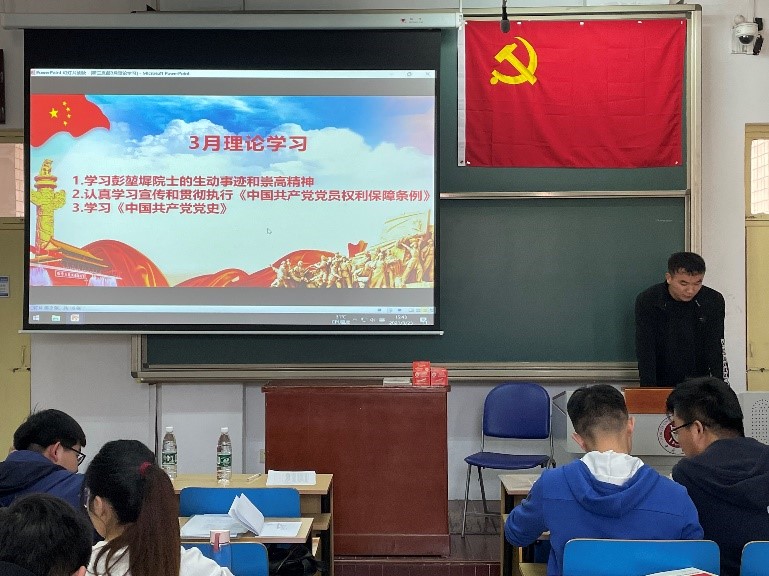 研三支部于主楼教室11410H开展3月集中理论学习活动,本月理论学习活动分两大部分:一是重要学习讨论内容,学习《中国共产党党史》以及认真学习宣传和贯彻执行《中国共产党党员权利保障条例》,二是联系实际学习,内容为学习彭堃墀院士的生动事迹和崇高精神。