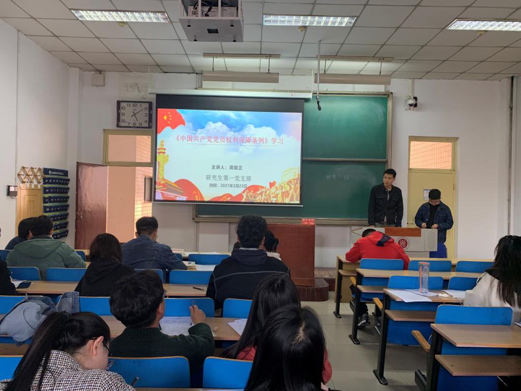 三月份的理论学习以学习《中国共产党党员权利保障条例》为主题,采取线下开展的方式进行了本次集中学习,研究生第一党支部全体党员和预备党员于2021年3月23日下午4:00在11310H进行线下集中学习。
