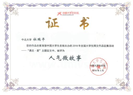 杜瑞平2018年3月在教育部中国大学生在线主办的2018年全国大学生网文作品征集活动中北评为“人气微故事”