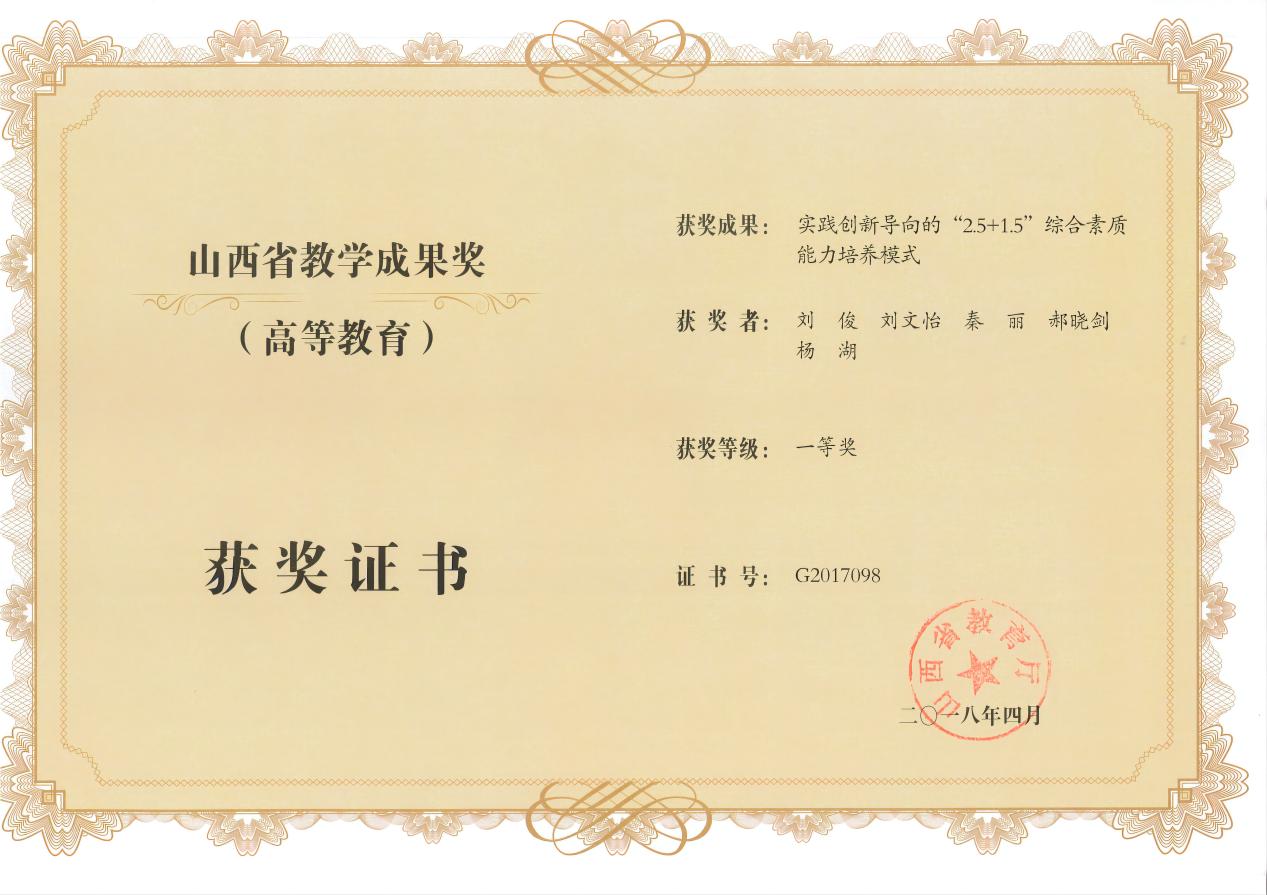 2017年山西省教学成果奖(高等教育)一等奖:实践创新导向的“2.5+1.5”综合素质能力培养模式