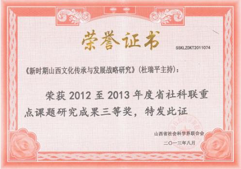 杜瑞平2013年8月获2012至2013年度省社科联重点课题研究成果三等奖