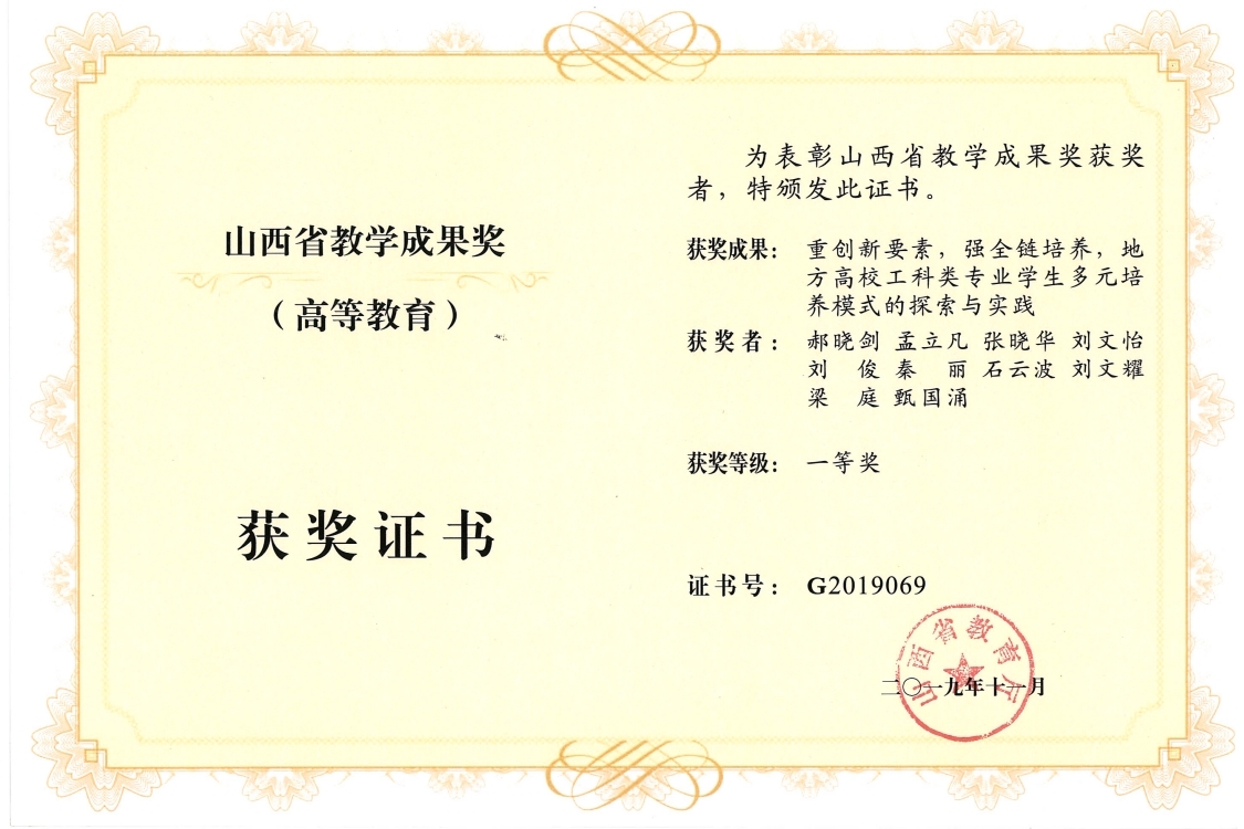 2019年山西省教学成果奖(高等教育)一等奖:重创新要素,强全链培养,地方高校工科类专业学生多元培养模式的探索与实践